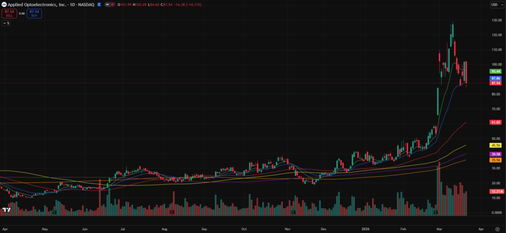 - AAOI – Strong earnings-driven gap last month with solid follow-through. Currently forming a base around the 10- and 21-day moving averages. Attempted to move higher on Thursday before pulling back on Friday. Could present a constructive setup in the coming weeks.