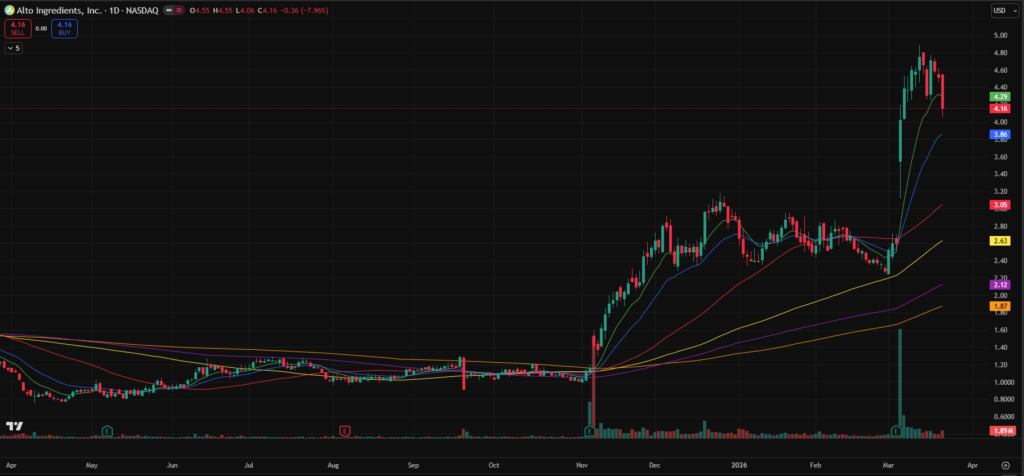 - ALTO – Pulling back toward the 10-day after a sharp move. Still extended in the short term, but could present an opportunity once the 21-day catches up with further consolidation.