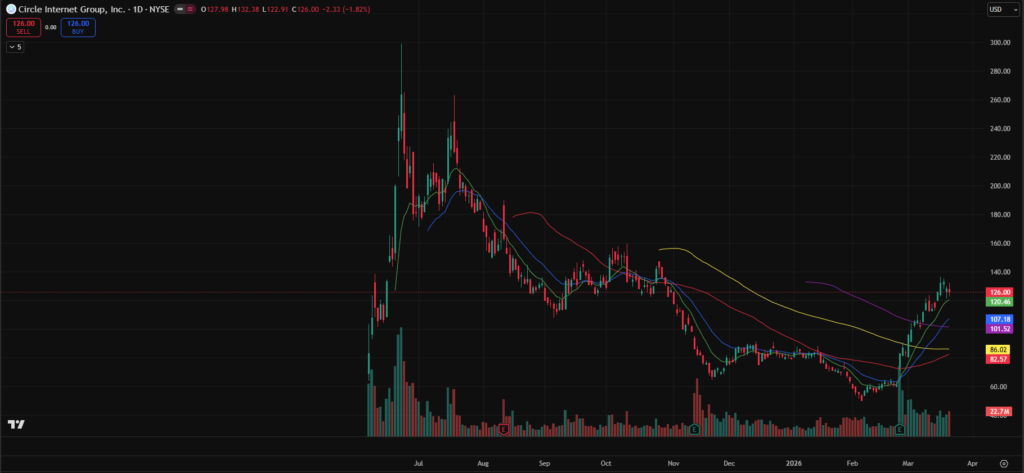 - CRCL – Pulling back toward the 10-day moving average after a strong run. Has given back very little of its gains and could continue higher if the market finds support.