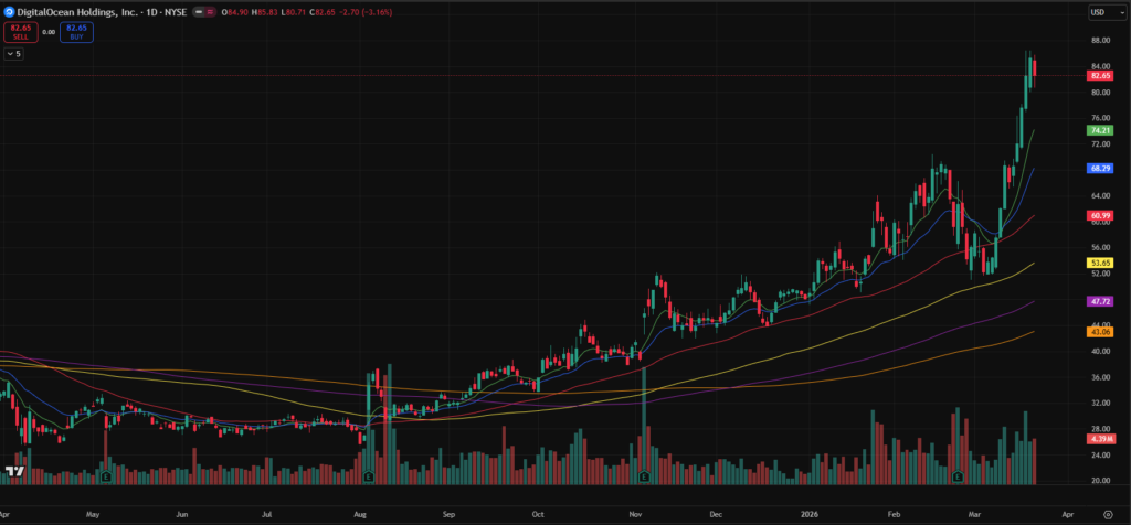 - DOCN – Up over 60% since early March. Currently extended, but worth monitoring for future setups following consolidation.