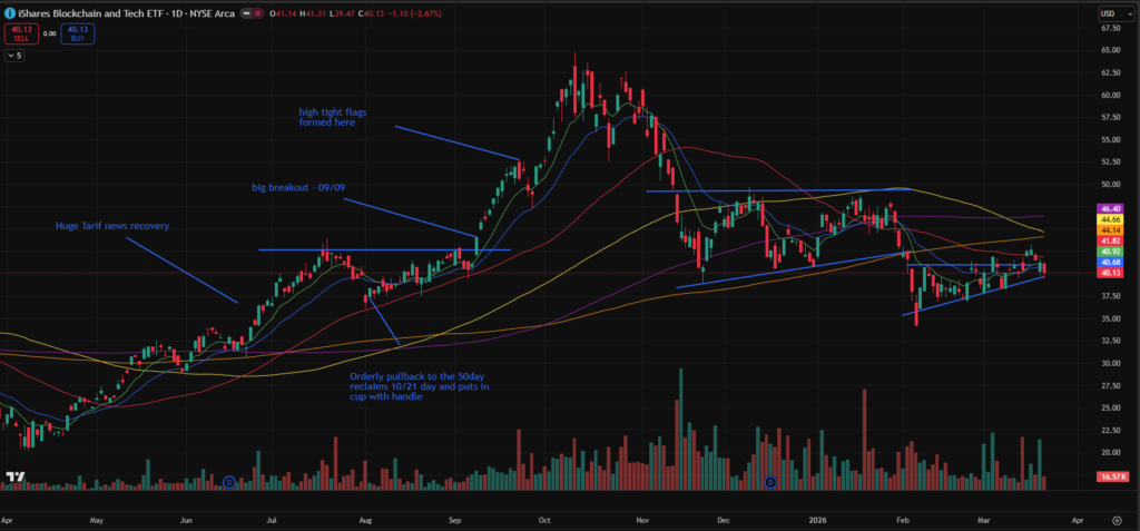 This week saw breakdowns across a number of sectors, and as a result I’ve reduced the number of themes tracked here. I will continue monitoring broader sectors, but will focus this section on areas that still show constructive structure or relative strength.