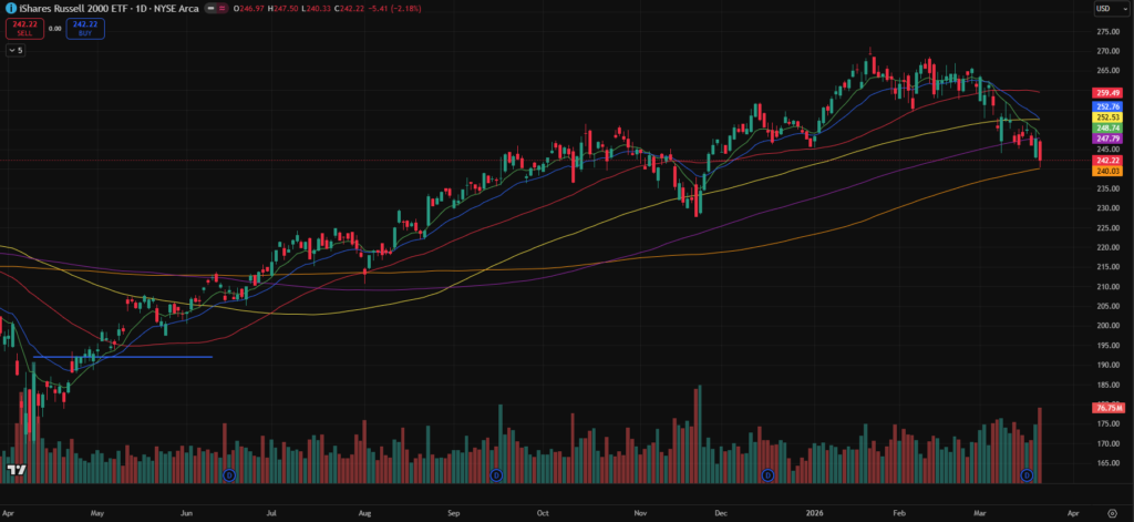 This week marked a clear increase in selling pressure across the indices. Both the S&P 500 and Nasdaq have now broken decisively below the 200-day moving average, with the Russell 2000 not far behind.
