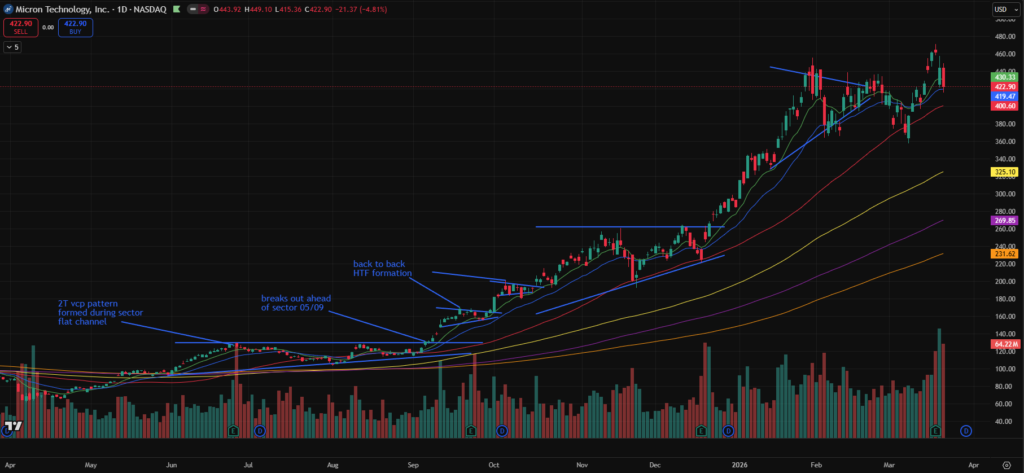 - MU – Pulling back toward the 10- and 21-day moving averages following a strong move off the 50-day in prior weeks.