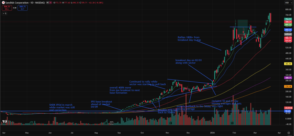 - SNDK – Pulling back to the 10-day after a strong run, while continuing to hold short-term moving averages — a sign of underlying strength.