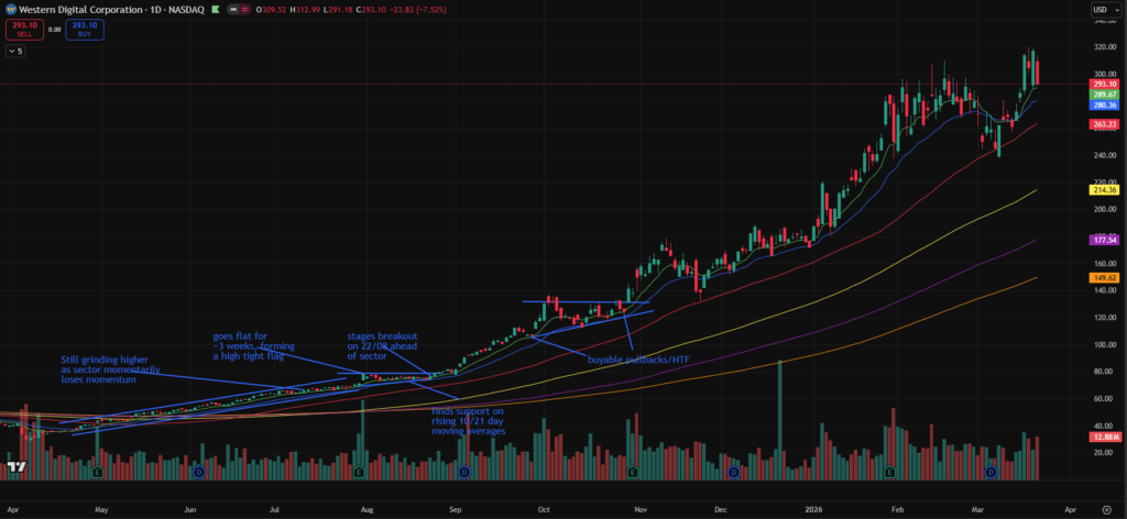 - WDC – Similar to MU, rallied strongly from the 50-day and is now retracing toward shorter-term support.