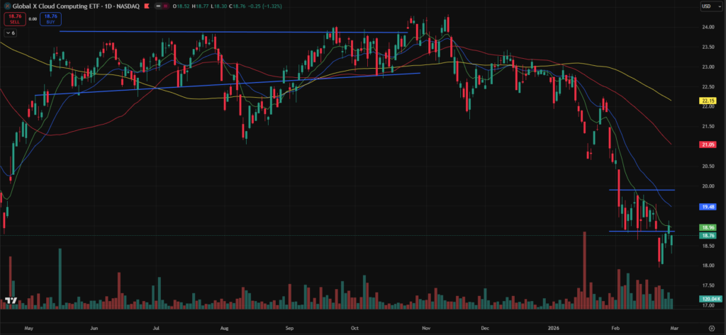 - CLOU / HACK – Appeared to break down from a bear flag structure before stabilising. If broader market weakness continues, this area could see further downside continuation.