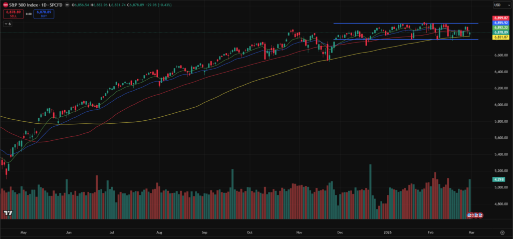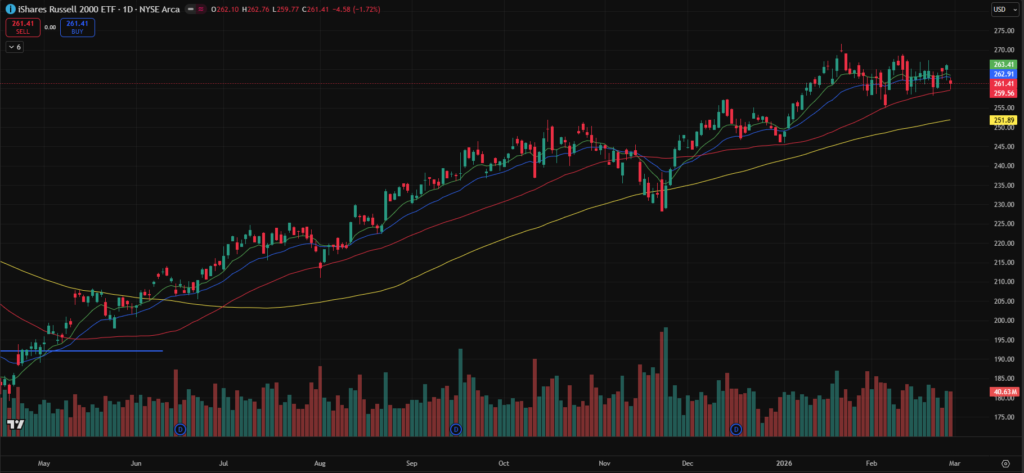 IWM remains relatively constructive by comparison, continuing to consolidate around the 50-day moving average. However, in the context of broader market weakness, this relative strength alone is not sufficient to sustain a convincingly bullish sentiment.