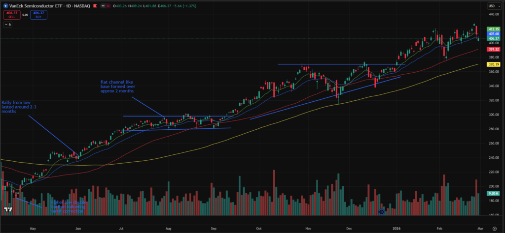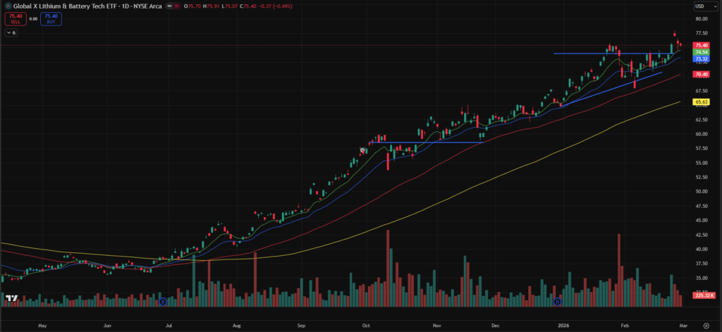 - LIT – Broke out earlier in the week before retracing toward the 10 and 21-day moving averages amid broader selling pressure. Despite the pullback, price continues to hold up relatively well and may offer opportunities if market conditions improve.