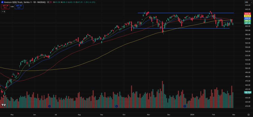 QQQs showed a similar pattern, briefly reclaiming the 50-day moving average midweek before rolling over. Price now sits below declining 10, 21, and 50-day moving averages, with a flat 100-day acting as overhead resistance and the 150-day currently providing support.