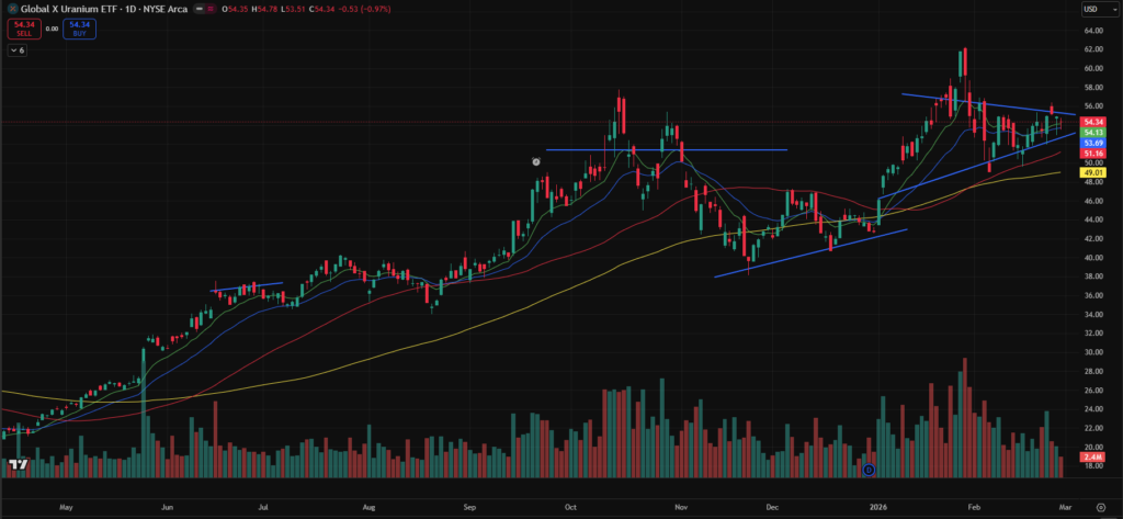 - NLR / URA – Saw a brief bounce off the 10 and 21-day moving averages before pulling back. The broader structure remains constructive, with tightening price action suggesting a potential base formation. A pickup in overall market momentum could support a breakout attempt.
